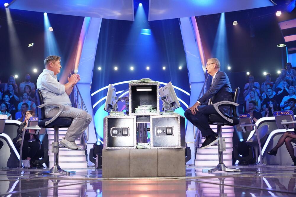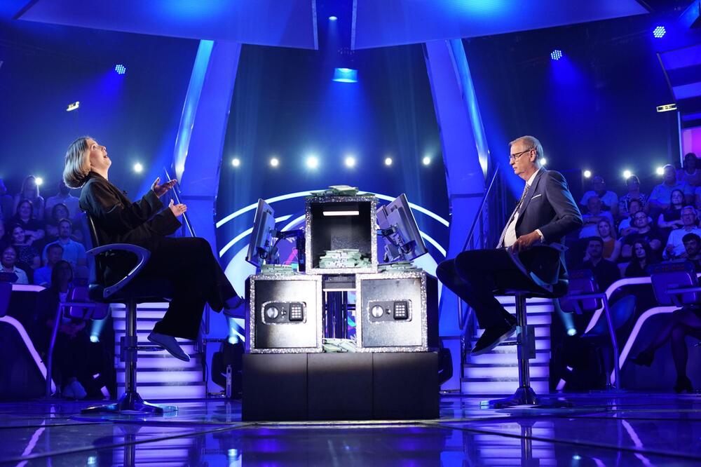 Doch zuerst will er Annalena Ziege (l.) und Sandra Pedersen (r.), die beide in den vorigen Shows 64.000 Euro und damit die höchste Summe gewonnen haben, zum Weiterspielen überreden. Der bisherige Gewinn wäre dann weg. Beide lehnen ab. Noch.