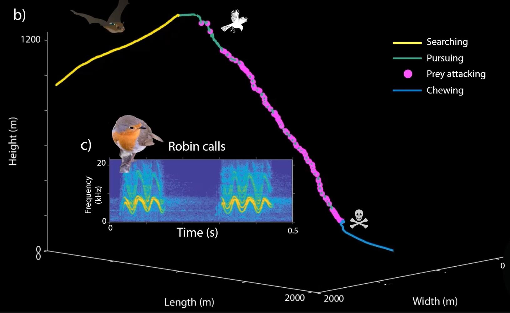 Und tatsächlich: Unter den mehr als 600 erfassten Jagdflügen der mit Sendern ausgestatteten Fledermäuse stachen zwei hervor, heisst es in einer Mitteilung zu Studie. Sie flogen nachts hoch in den Himmel und starteten dann Angriffe auf Singvögel, die sie in steilen, rasanten Sturzflügen in Richtung Boden verfolgten.