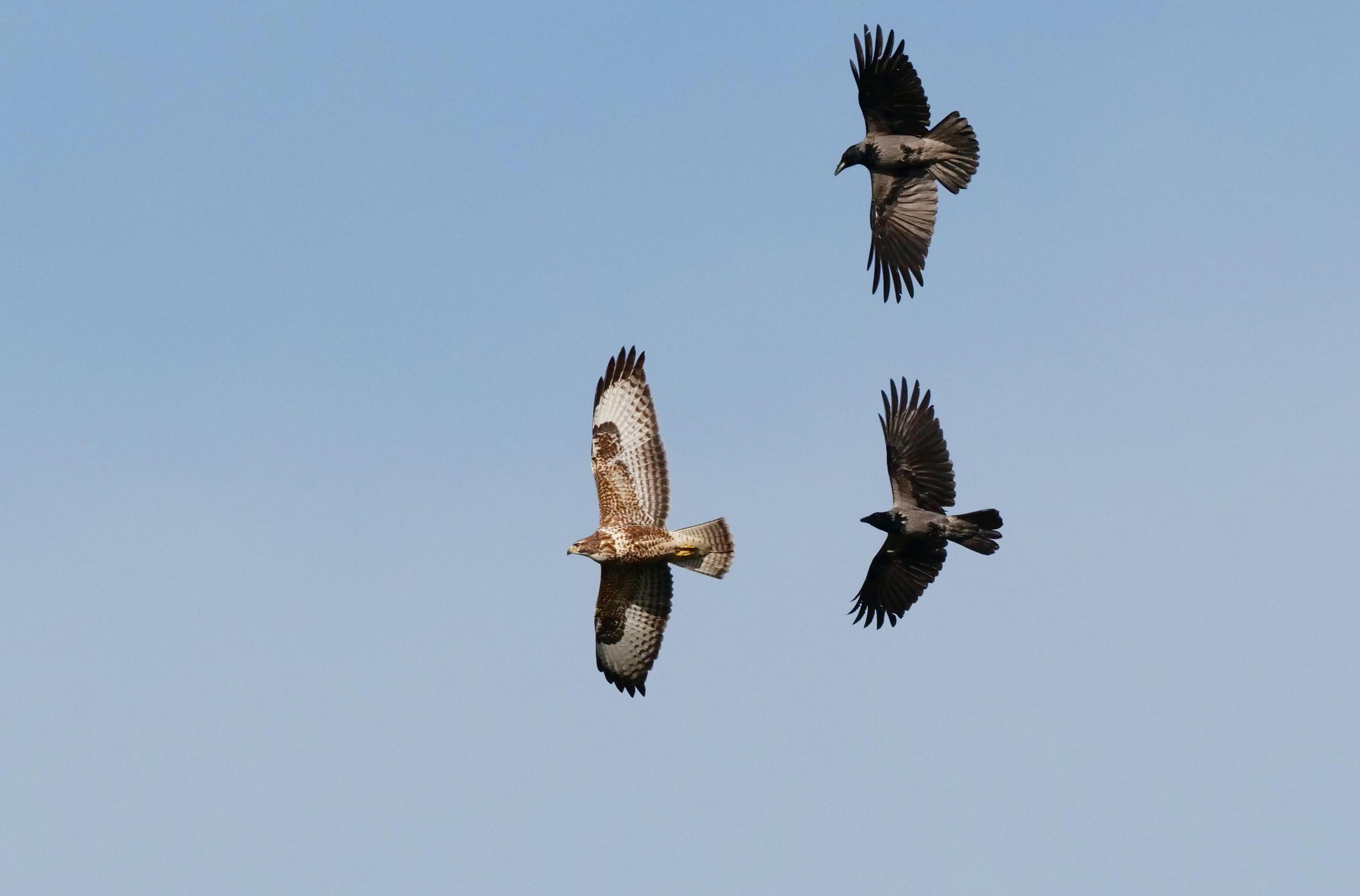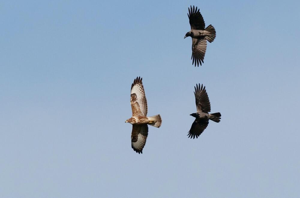 Krähen haben ein komplexes Sozialverhalten. Für uns mögen sie alle gleich klingen, doch jede einzelne von ihnen hat eine individuelle Krächzstimme, an der Artgenossen sie wiedererkennen können. Im Herbst und Winter versammeln sich Krähen wie erwähnt häufig in Scharen, um Informationen auszutauschen. Auch während der Brutzeit halten sie zusammen, falls es einen Feind zu vertreiben gilt. Dann lässt sich beobachten, wie sie einen Mäusebussard oder einen Habicht am Himmel drangsalieren oder mit gezielten Sturzflügen einen Fuchs in die Flucht schlagen.